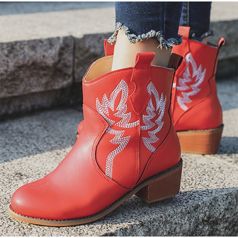Women Ankle Boots Chunky Heels Embroidered Slip On Wedges Short Plush