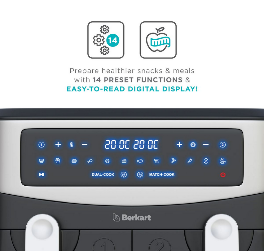Please Note: An additional "Berkart 9L Drawer & Tray Set Accessory" for the Berkart 9L Dual Air Fryer is sold separately to provide bigger capacity cooking.