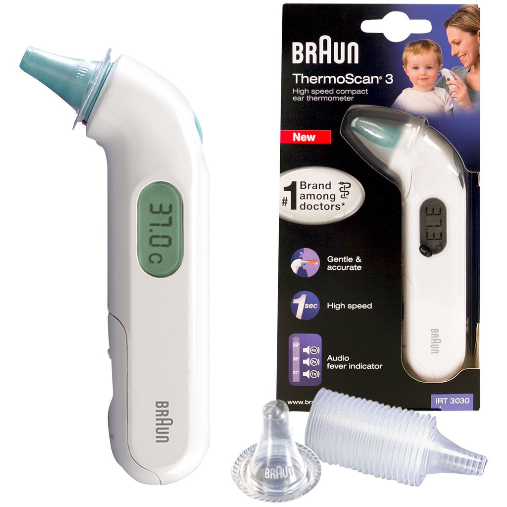 The Braun Thermoscan 3 is an ear thermometer that is designed to give accurate readings quickly and comfortably. Its infrared technology registers temperature in one second, eliminating the need for long wait times. Its memory function also records the last temperature taken for easy tracking.