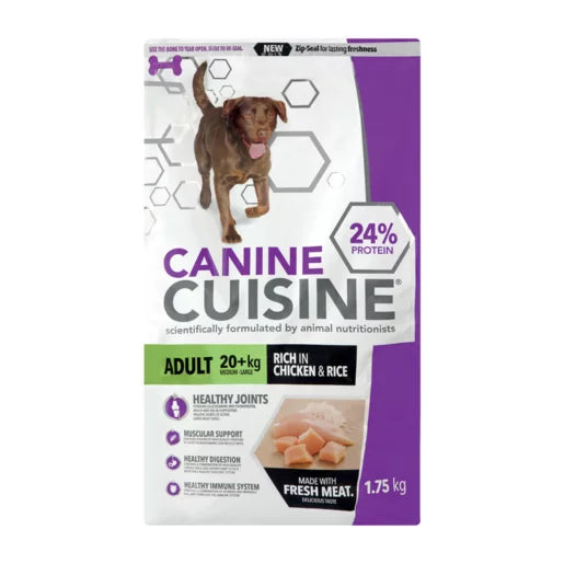 Specially designed for medium to large adult dogs, our Canine Cuisine Chicken & Rice Dry Dog Food is expertly crafted with real chicken as the first ingredient, providing essential nutrients for a healthy and active lifestyle. Made with high-quality ingredients, this 1.75kg bag is the perfect choice for your furry friend's overall well-being.