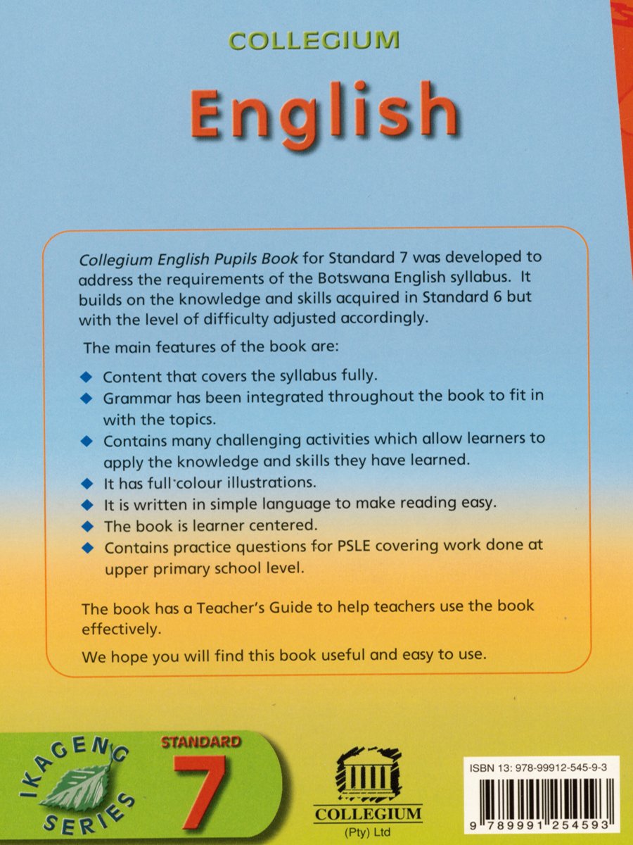 This standard 7 English pupils book, from Collegium, is designed by industry experts to provide comprehensive language development. With an array of exercises and engaging topics, this book allows students to enhance their English skills in a professional and informative manner.