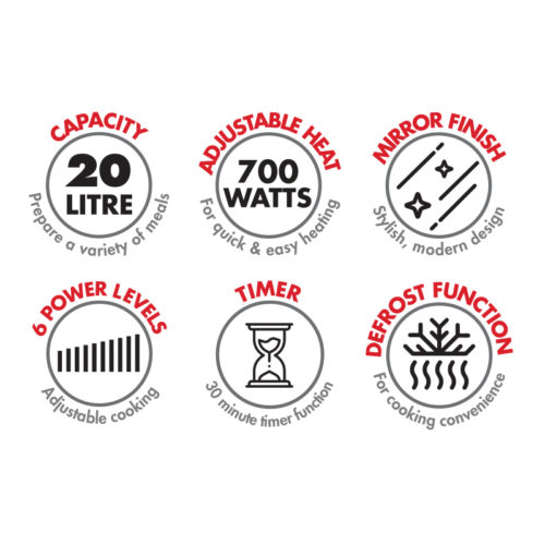 Add a touch of classic elegance to your kitchen with the sleek chrome finishes & elegant mirror glass door. Warm up food or take on any cooking challenge with the easy-to-use classic controls, 6 power levels, 30 min cooking timer, convenient defrost function & easy to clean white interior.