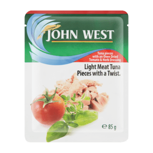 John West tuna pieces with an oven dried tomato & herb dressing. Light meat tuna pieces with a twist.