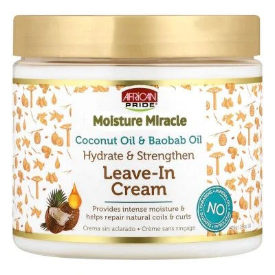 African Pride Moisture Miracle Coconut Oil & Baobab Oil Leave-In Cream moisturizes hair using a nourishing blend of Baobab & Coconut Oil to add lasting hydration while protecting against breakage; leaving hair manageable & strong. FEATURED INGREDIENTS - Enriched with Coconut Oil: Deeply conditions, hydrates and helps repair; Baobab Oil: Restores and helps strengthen damaged hair, locks in moisture. NATURALLY FORMULATED - The ingredients within African Pride products are free of harmful components, including parabens, mineral oil, sulfates, & petrolatum. By utilizing natural ingredients, we are able to provide high quality, safe products. HOW TO USE - Apply a generous amount to hands, rub together, smooth product into dry or damp hair from roots to ends. Do not rinse. Style as desired. Use as a daily moisturizer or layering with styling products. ABOUT THE BRAND - The Moisture Miracle line of products is naturally created for the specific needs of coily & curly textures. Every product in our Moisture Miracle collection is made with a unique, signature blend of rich African ingredients.