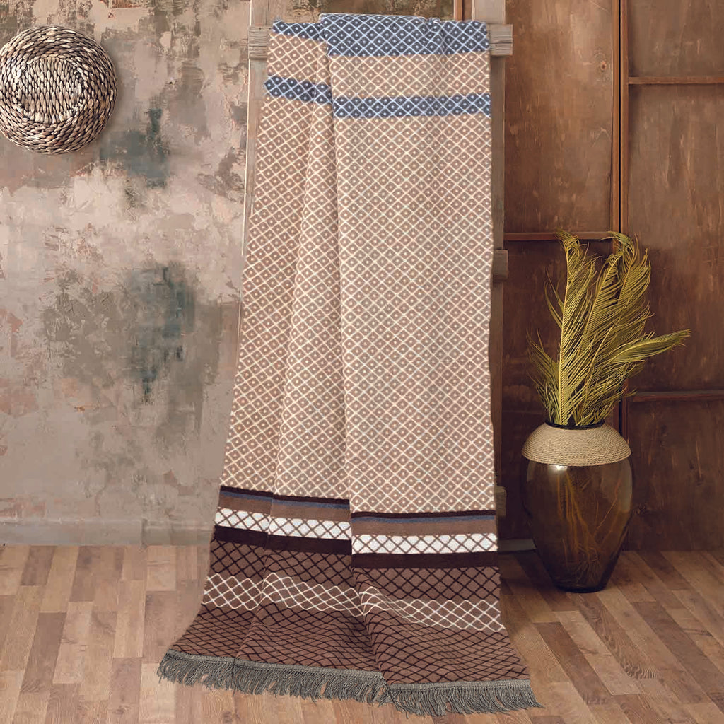 Cotton blankets are available in various designs and types of finishes. They characterized by high quality of workmanship and materials used. They are soft and delicate, and thanks to their functionality, they perfectly replace traditional bedspreads. They are packed in an aesthetic PVC bag with a zipper. The blankets are made of certified fabrics. Composition: 58% cotton, 32% acrylic, 10% polyester Weight: 450 g/m 2 Finishing: fringe Size: 150x200 cm. Colors presented on pictures may slighlty differ from actual.