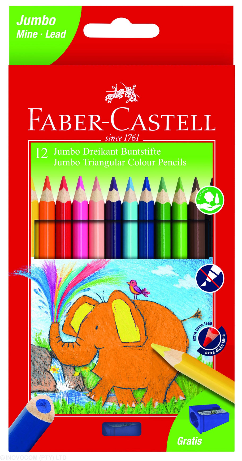 EcoPencil, Non-toxic, brilliant colours, jumbo triangular size for easy handling by small hands, 5.4mm lead diameter, break-resistant leads, Free jumbo sharpener.