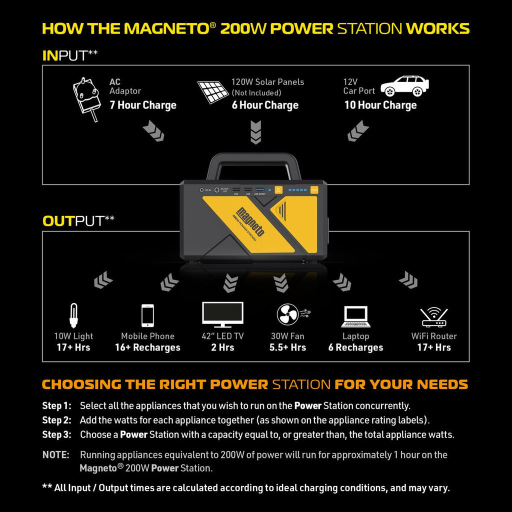 The magneto 200w portable power station can charge/power any device that uses less than 200w. Please check the operating power of your device/s before use.