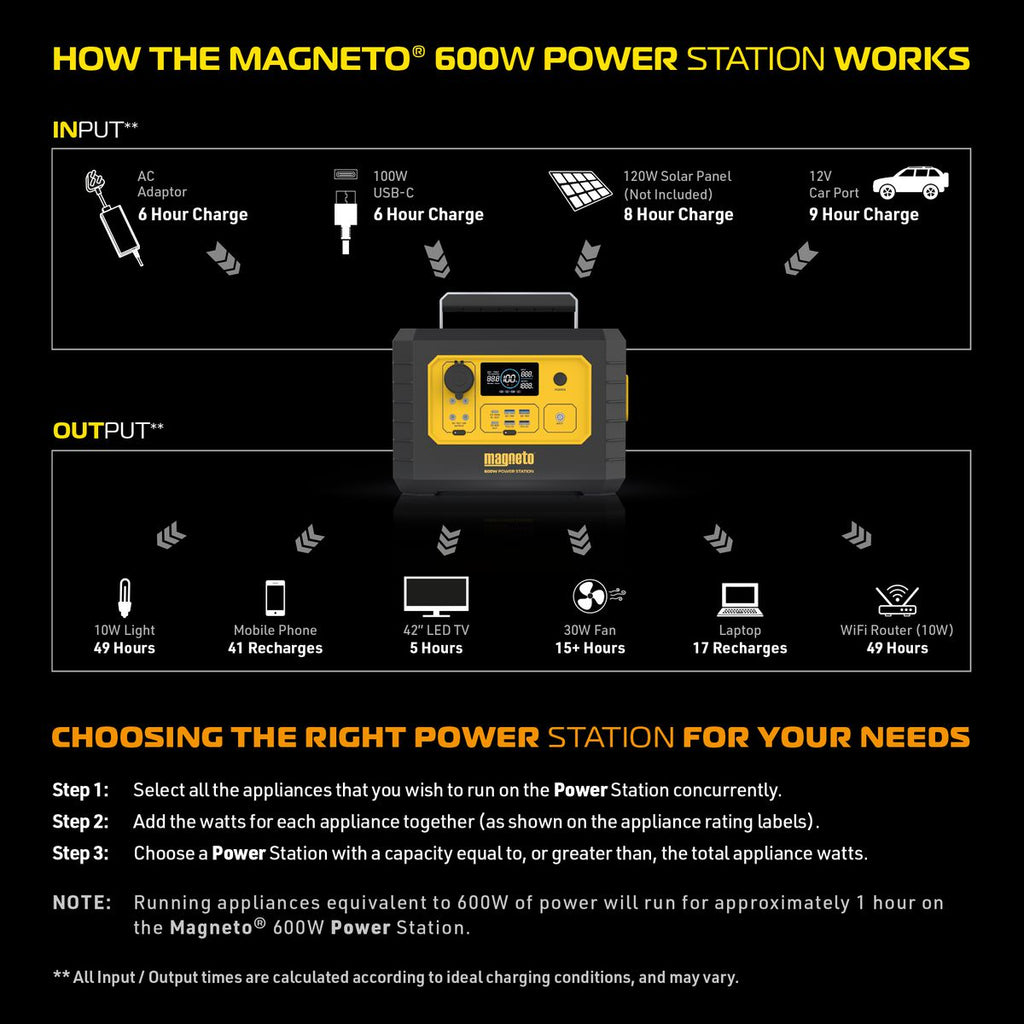 The magneto 600w portable power station can charge/power any device that uses less than 600w. Please check the operating power of your device/s before use.