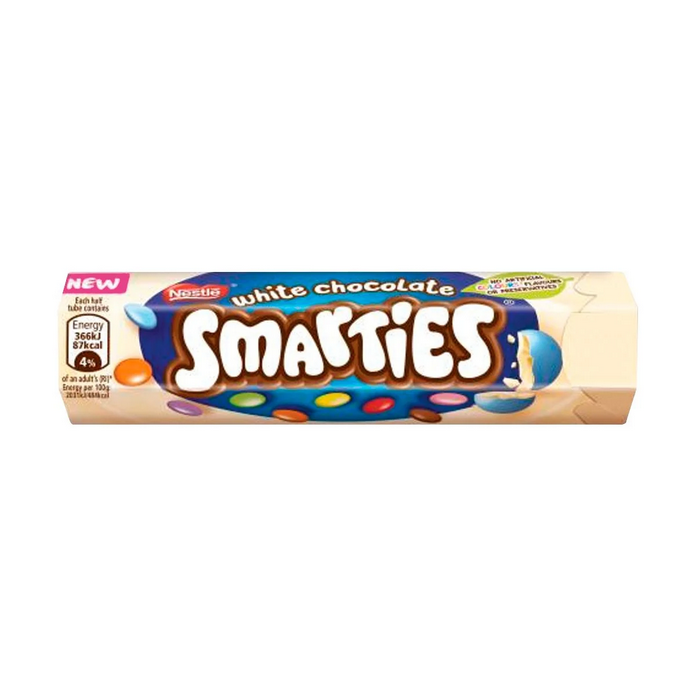 Nestle Tube 120g Smartie White is a delicious snack option that combines creamy white chocolate with colorful and crunchy smarties. With its perfect balance of flavors, this treat is sure to satisfy your cravings. Enjoy the delectable taste of Nestle's signature chocolate with the added fun of smarties.