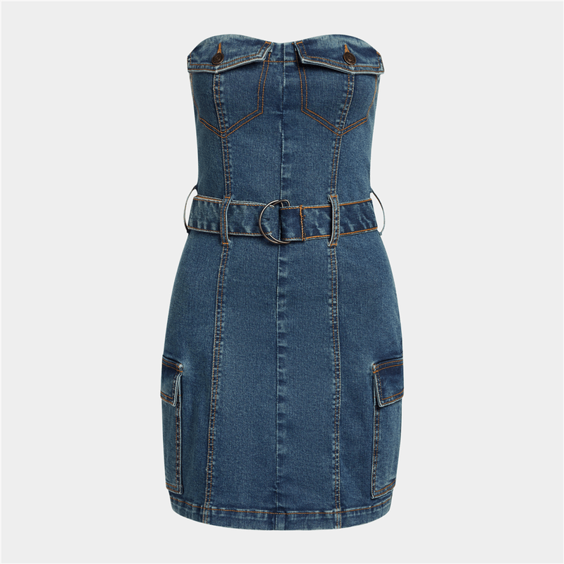 It's denim or nothin' over here yo, denim stretch fabric, belt loops and a cute belt, cargo pockets and most of all a super sexy mini bandeau design. All packaged into one must-have season item! Literal chills ya'll.